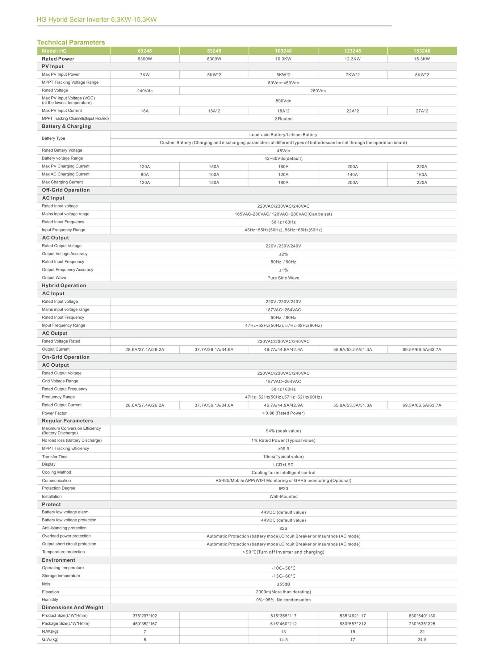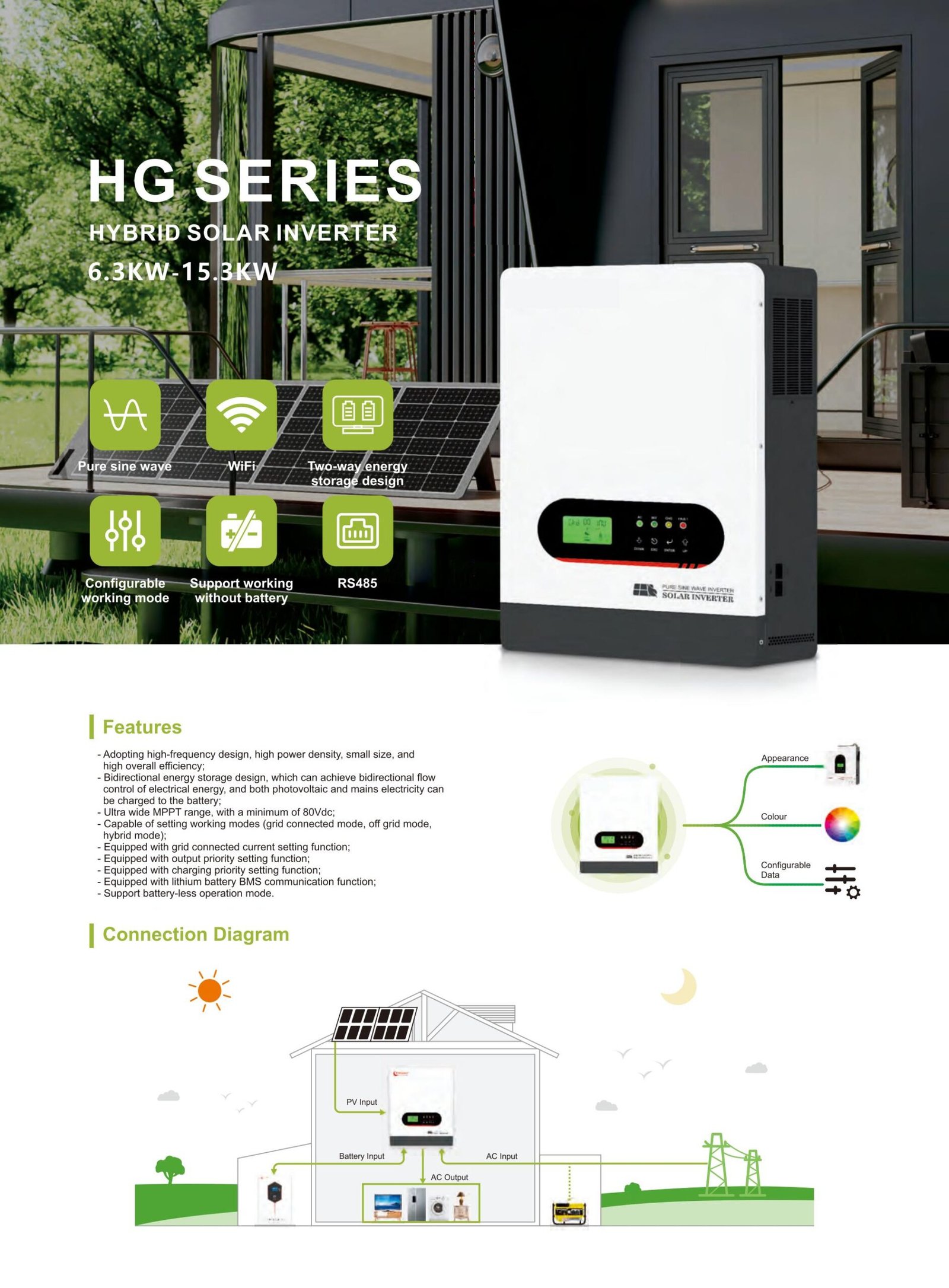 Three-phase compatible high-power hybrid inverter with dual MPPT, high efficiency, and smart cooling. Supports on-grid, off-grid, and hybrid modes with complete protection.