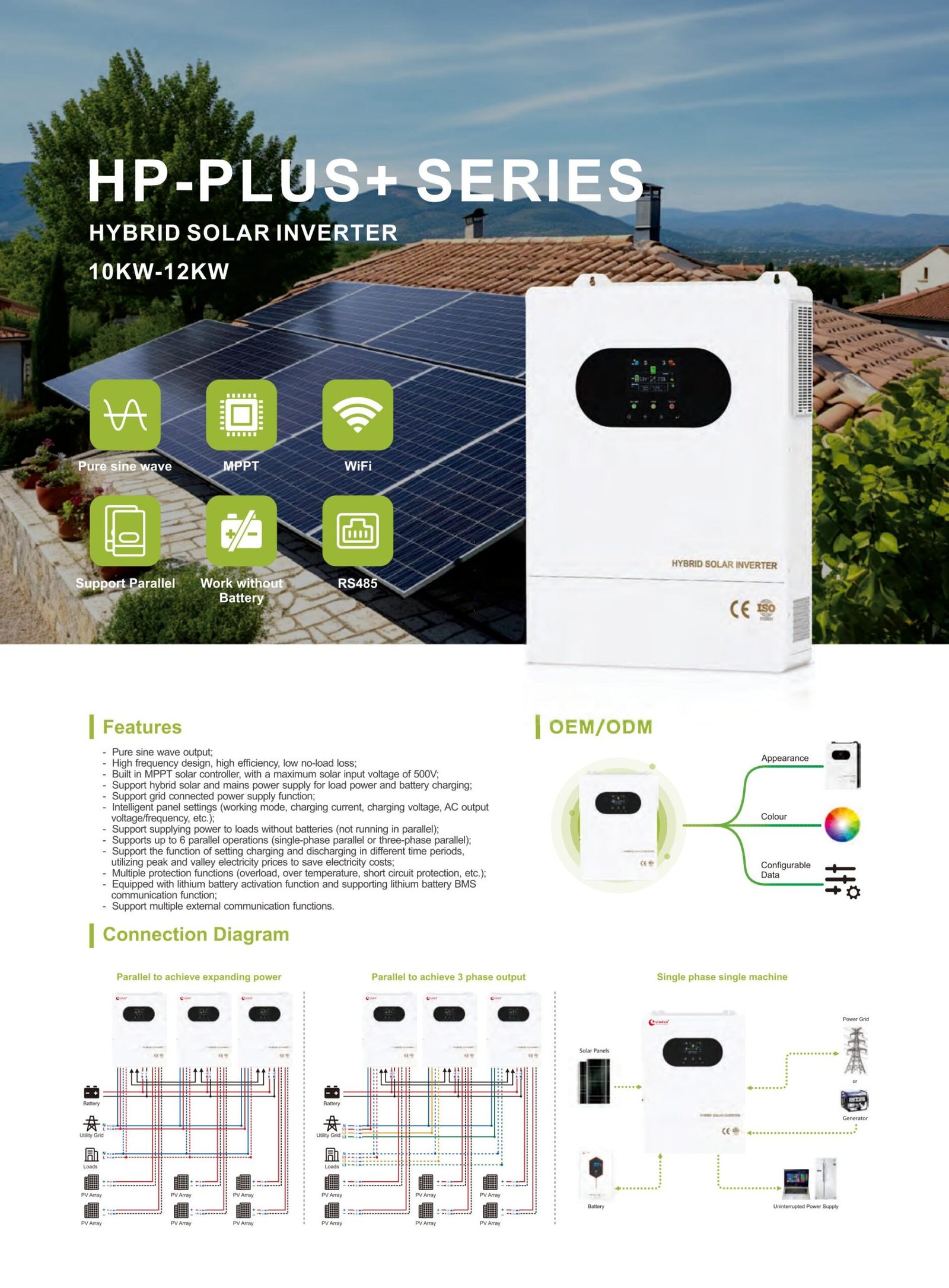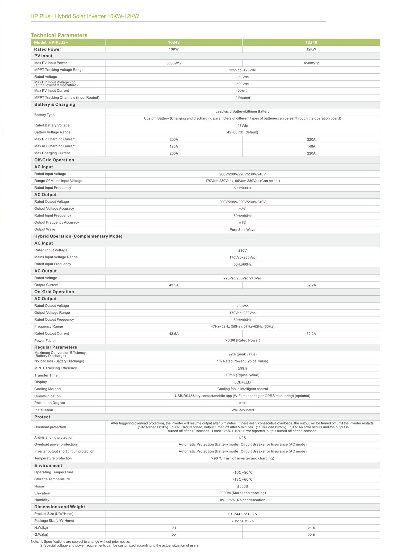 High-power hybrid inverter with 48V battery system, dual MPPT, and wide PV input. Supports WiFi monitoring, RS485, and multiple protections. High efficiency and strong overload capability.