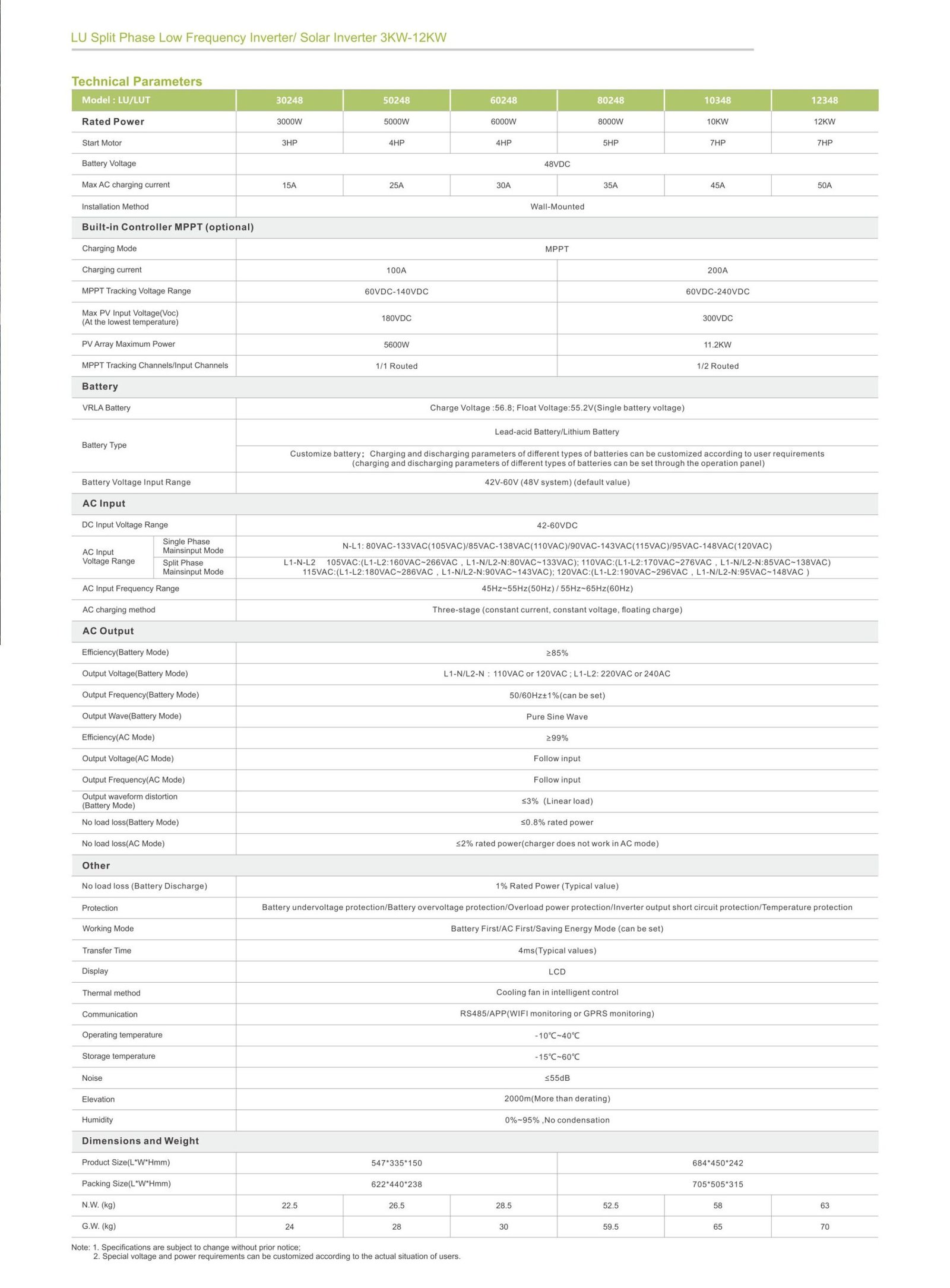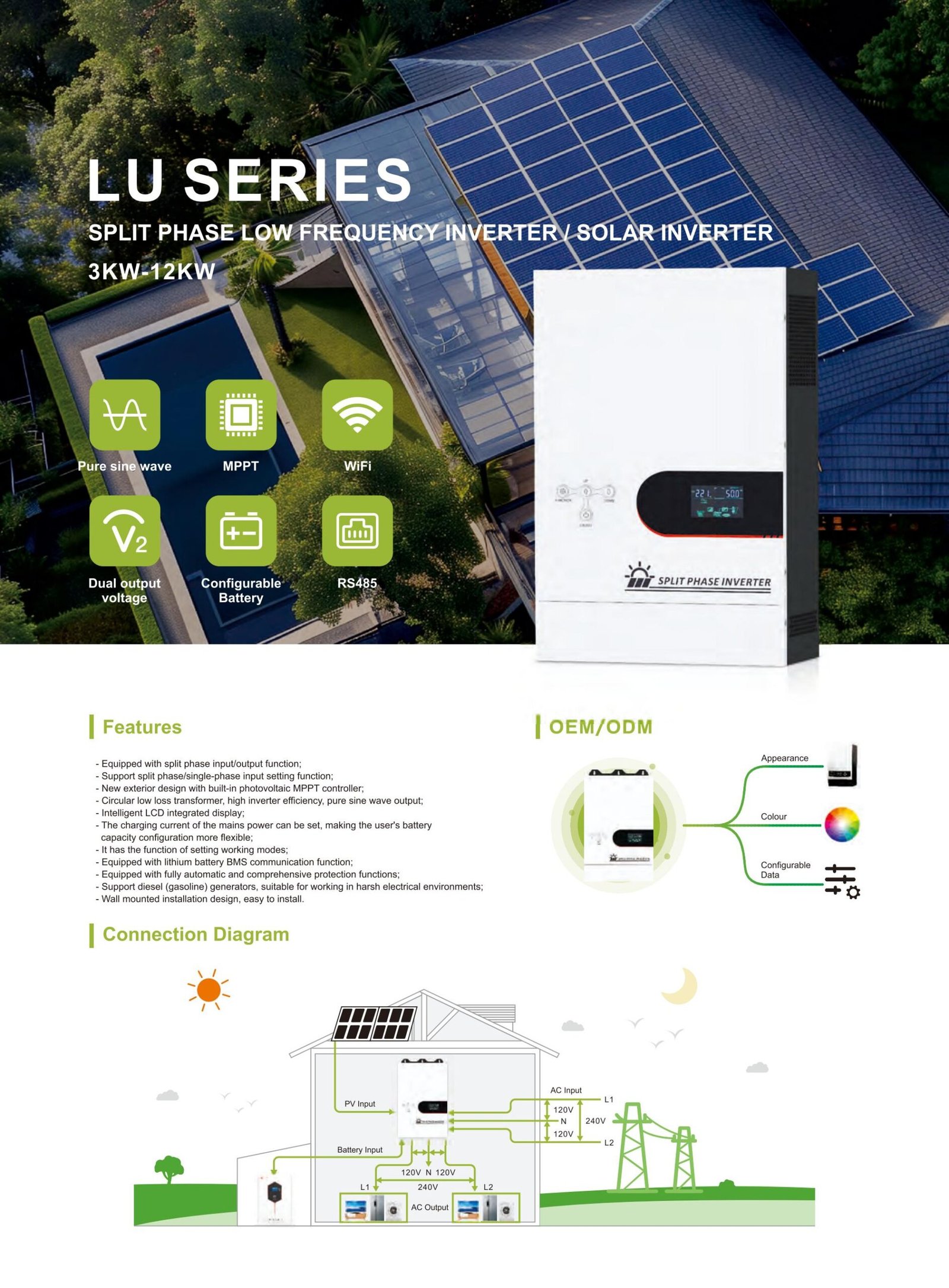Split-phase low-frequency inverter with BMS communication, adjustable charging current, and wall-mounted design. Stable for inductive loads.