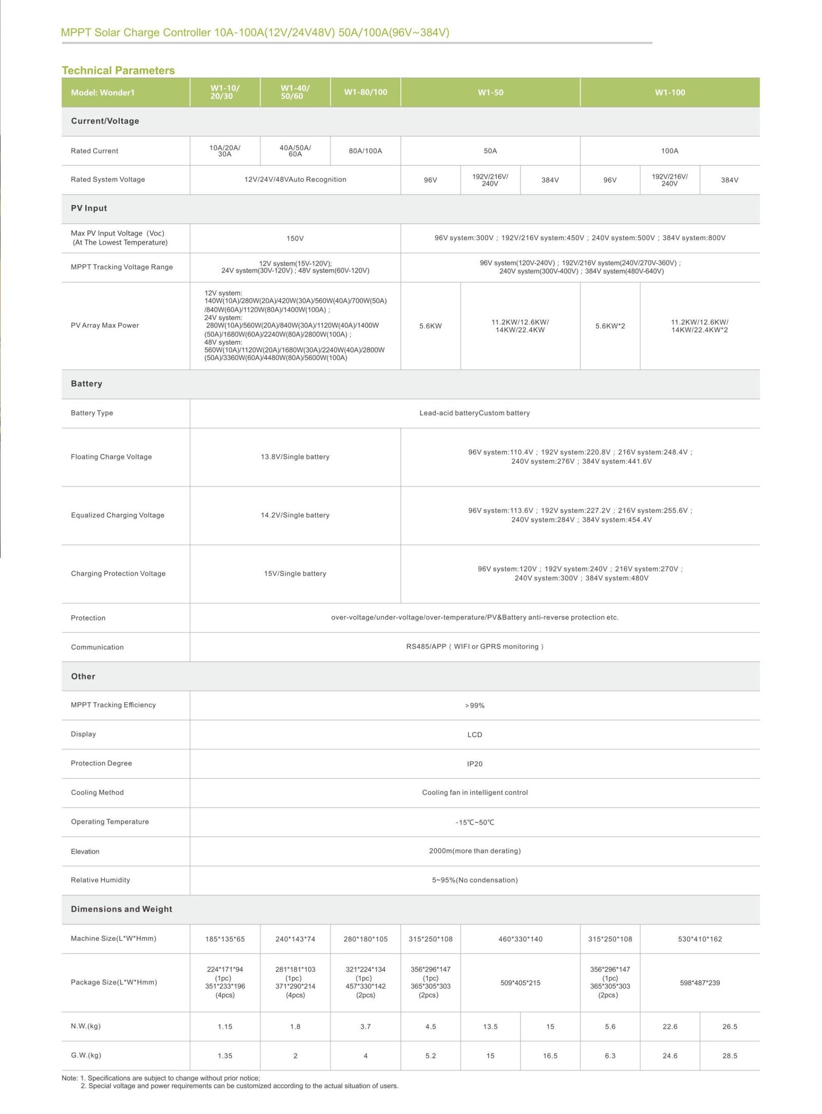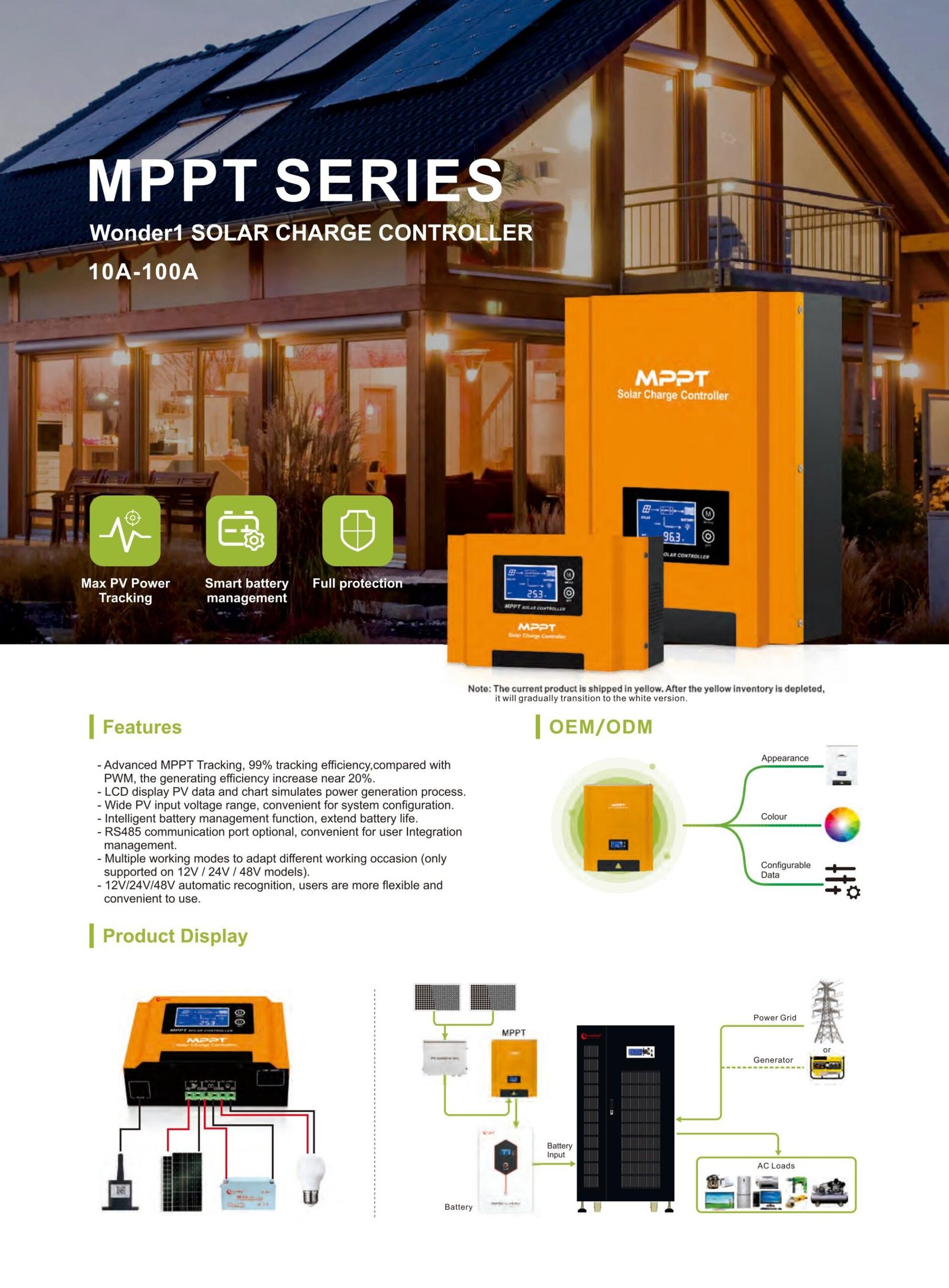 High-efficiency MPPT solar controller with >99.9% tracking efficiency, LCD display, and wide PV input. Supports 12V/24V/48V automatic recognition.