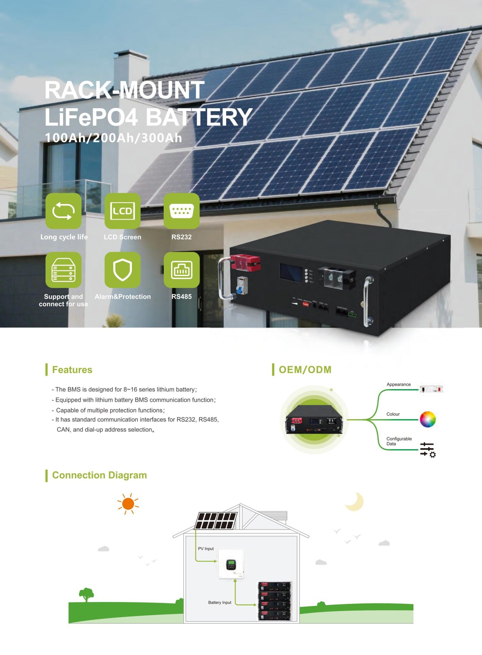 Server-rack type LiFePO4 battery with LCD, multiple protections, and standard communication ports. Suitable for commercial & industrial ESS.