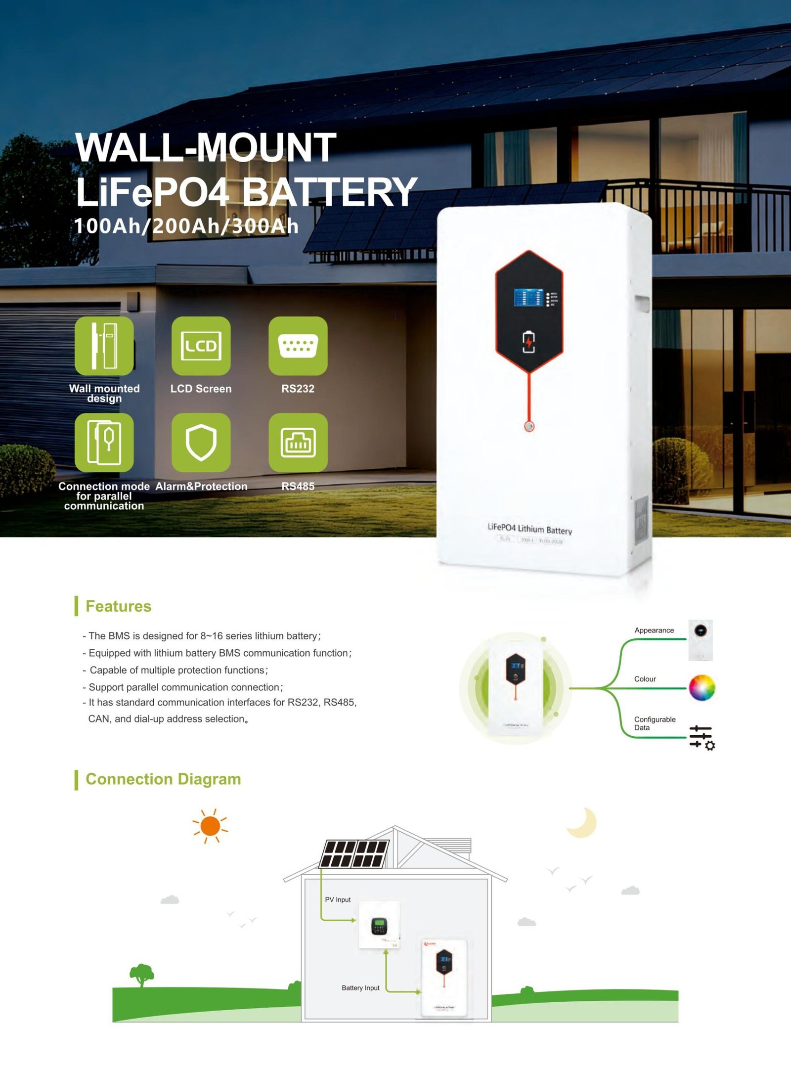 Wall-mounted lithium iron phosphate battery with long cycle life, BMS protection, and CAN/RS485 communication. Safe and stable for solar energy storage.