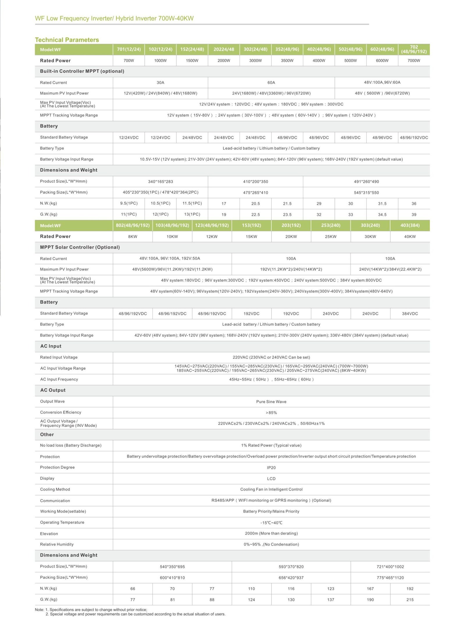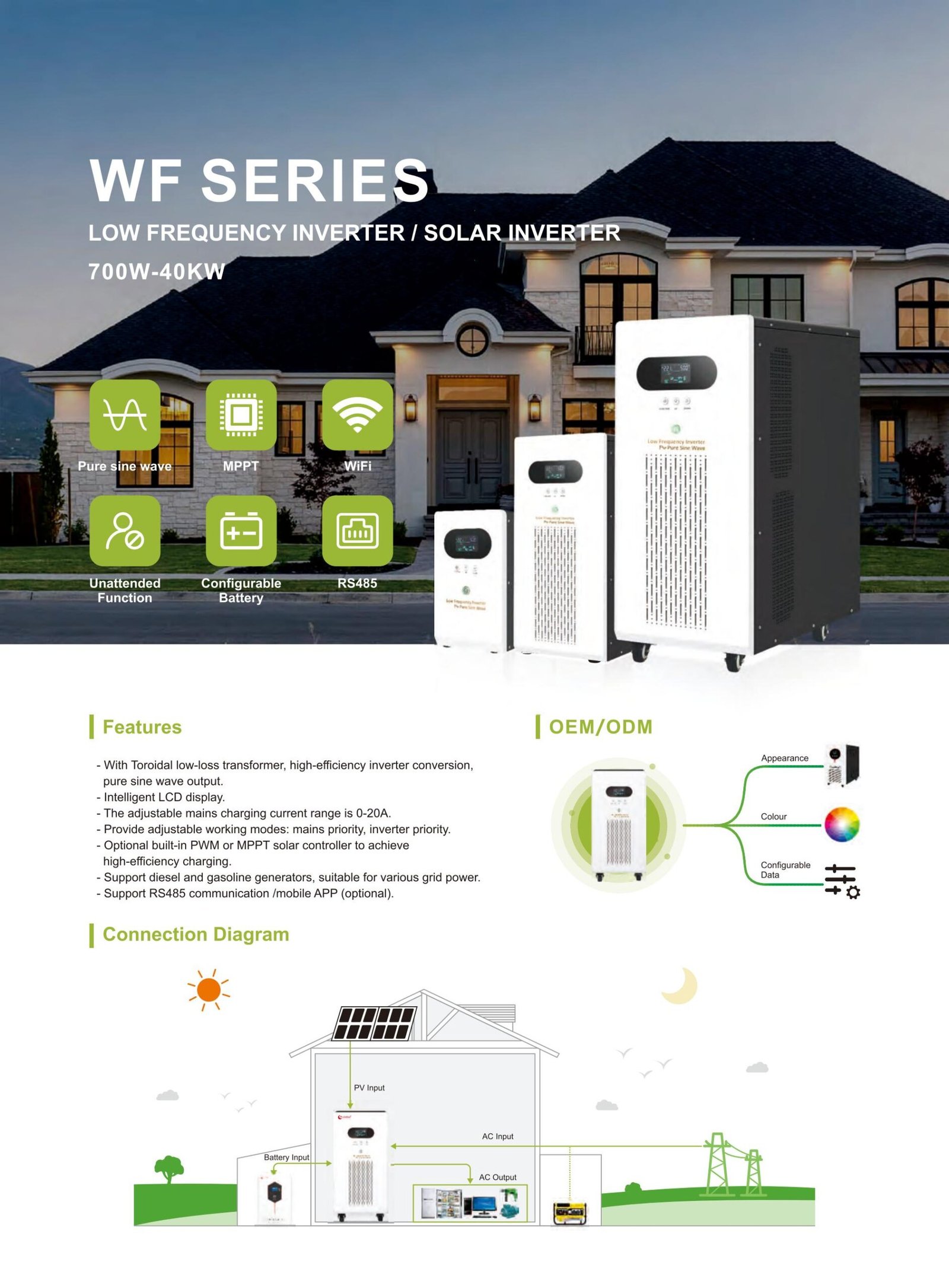 Ultra-wide power range low-frequency inverter with toroidal transformer, MPPT, and unattended operation. Supports generator, solar, and grid charging.